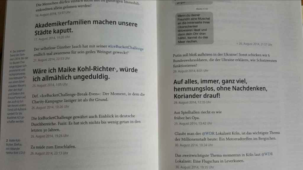 Zugegeben ist es ein wenig seltsam ein Buch in der Hand zu halten und sich Tweets durchzulesen. Digital macht unvernetzt eigentlich keinen Spaß. Das wäre ja wie analog, nur kleiner mit größerem Volumen. Aber „gefolgt von niemanden, dem du folgst“ soll auch gar nicht Spaß machen, zumindest nicht vorrangig.