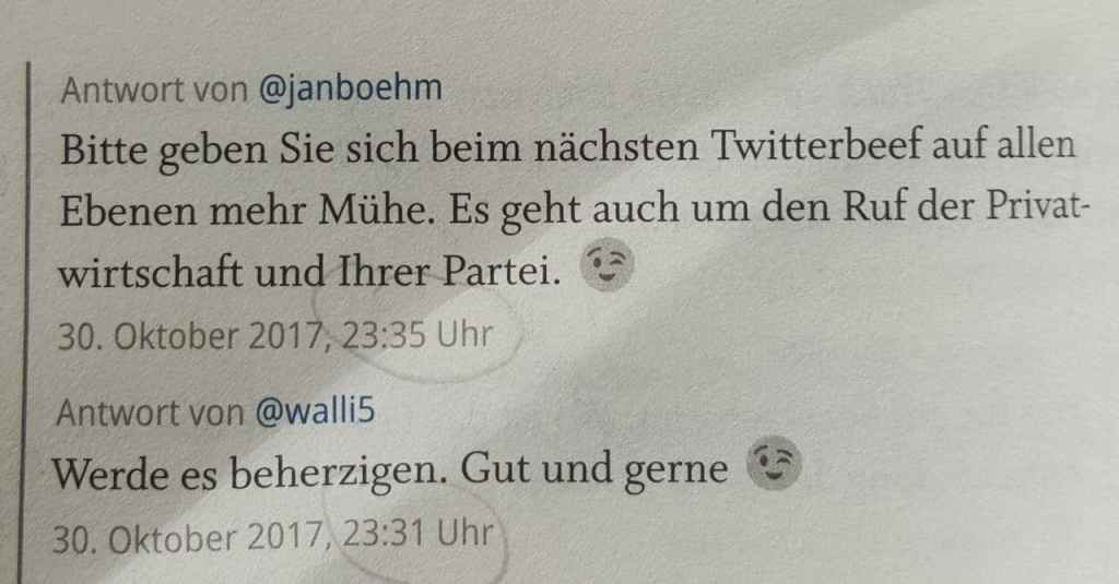 Interessanterweise wird auch die Medienblase, in der Jan Böhmermann sich befindet, deutlich nachgezeichnet. Personen des öffentlichen Lebens, wie Katrin Bauerfeind, Olli Schulz, Guilia Becker oder auch Saša Stanišić, kommen zu Wort. Da die Twitternamen nicht immer eindeutig ihren Besitzenden zuzuordnen sind, gibt es auch hier eine kurze Erklärung in Form von Fußnoten. Und erneut zieht sich das Meinungskorsett zusammen und es lassen sich persönliche Vorlieben erkennen. Beispielsweise wird Patrick Strenzel als „Mensch“ vorgestellt und suggeriert der Leserschaft bereits, ob es sich um „Freund“ oder „Feind“ handelt.