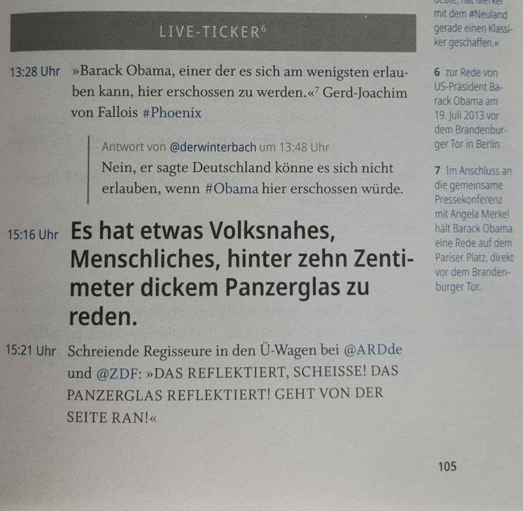 Viele der Tweets sind mit Fußnoten versehen, die mit Hintergrundinformationen zu gesellschaftlichen und politischen Ereignissen auftrumpfen. Aber auch diese Fußnoten strotzen vor Meinungen des Autors. Dieses Meinungskorsett wird noch enger, wenn einem auffällt, dass es sogar zeitliche Ungereimtheiten gibt.